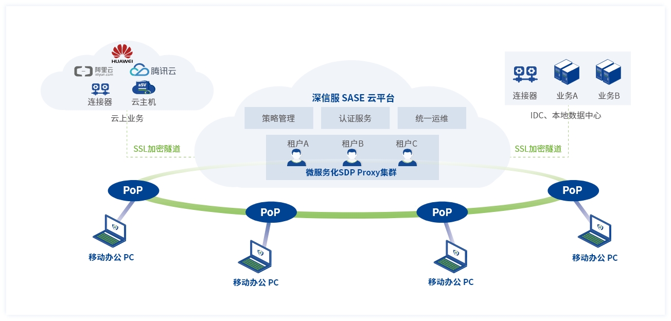 無論企業業務是在本地數據中心,還是在托管云或者公有云,都可以通過輕量級的連接器,在內網應用和PoP之間建立SSL加密隧道。