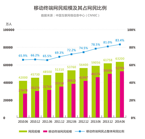 中國移動互聯網用戶已超PC網民。據中國互聯網絡信息中心(CNNIC)數據顯示,截至2014年6月,中國移動互聯網用戶為5.27億,覆蓋率達83.4%, 首頁次超越傳統PC整體80.9%的使用率,移動互聯網用戶成為 大上網群體。